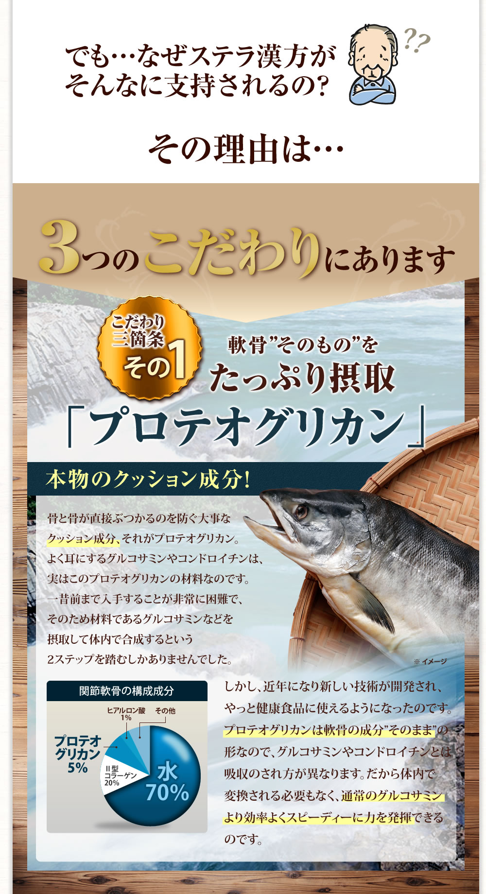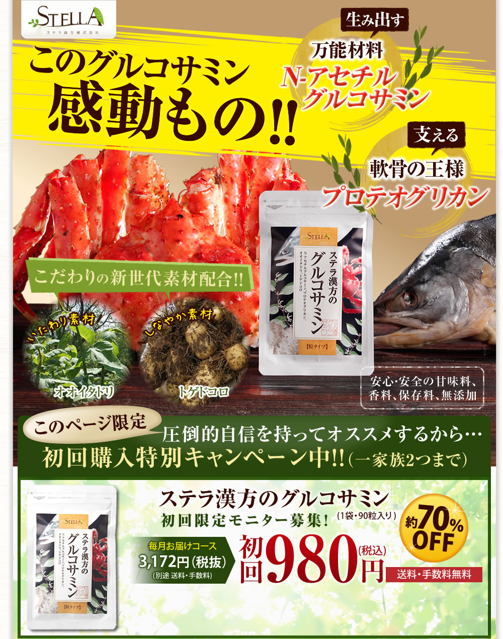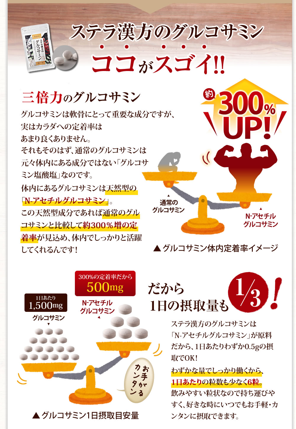 膝や関節痛のお悩みにヒアルロン酸の元Nアセチルグルコサミン配合 ステラ漢方のグルコサミン